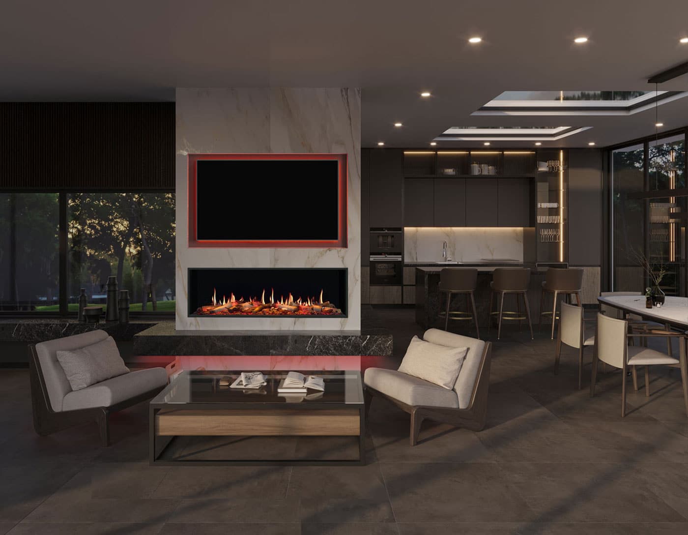 parast med et valfritt stemningsbelysningssystem, som tilbyr opptil seks meter med fleksible LED-striper som diskret kan installerast rundt ein TV eller langs hyller for å forbedre ildens uttrykk og effekt, spesielt egna for eit imponerande midtpunkt på veggen.