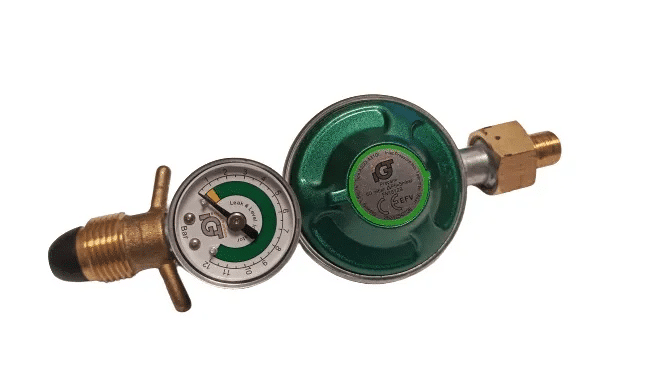50mbar regulator med POL – kobling og 1/4″V ut. Den har slangebruddsventil og lekkasje/mengde indikator.