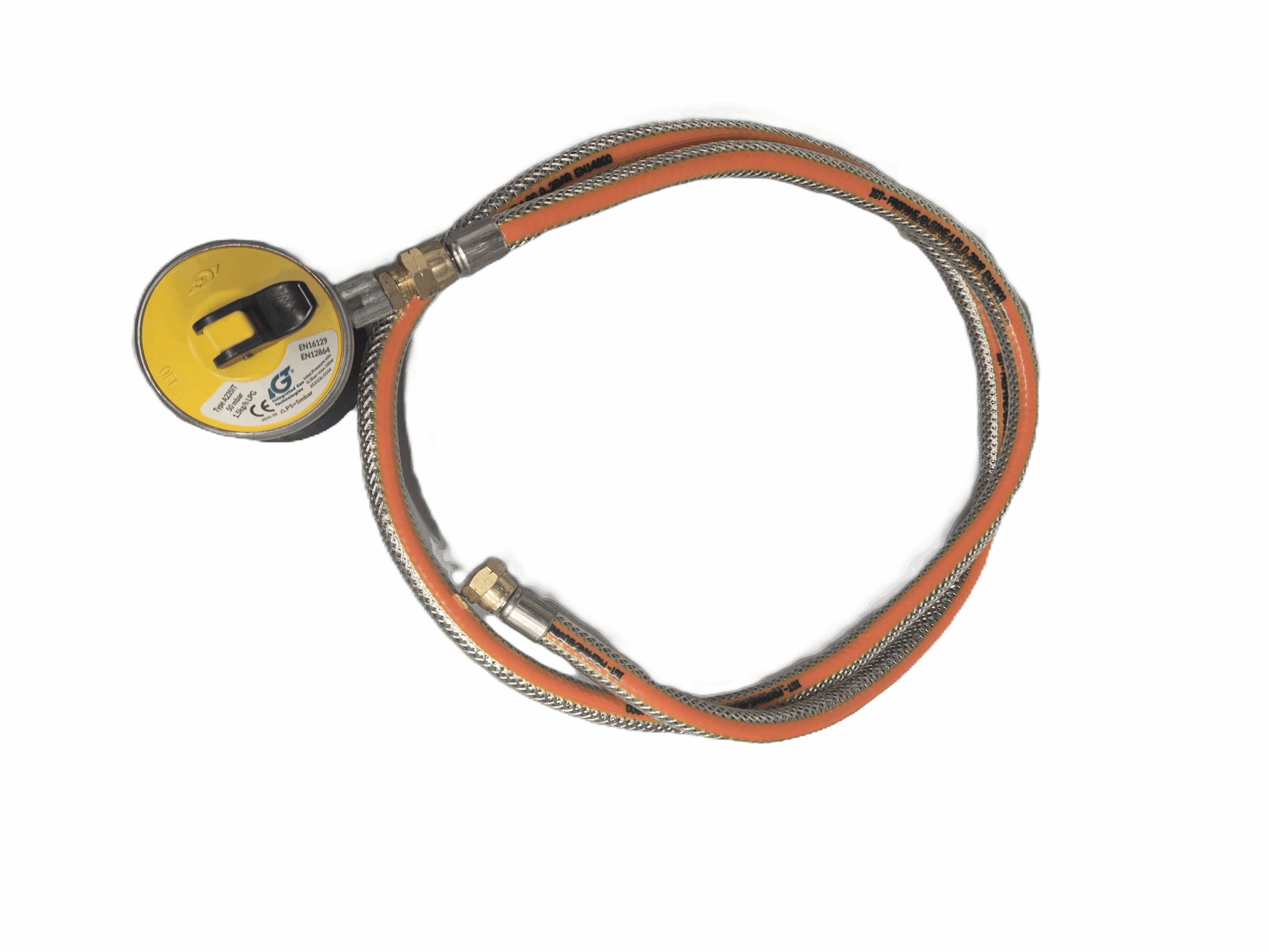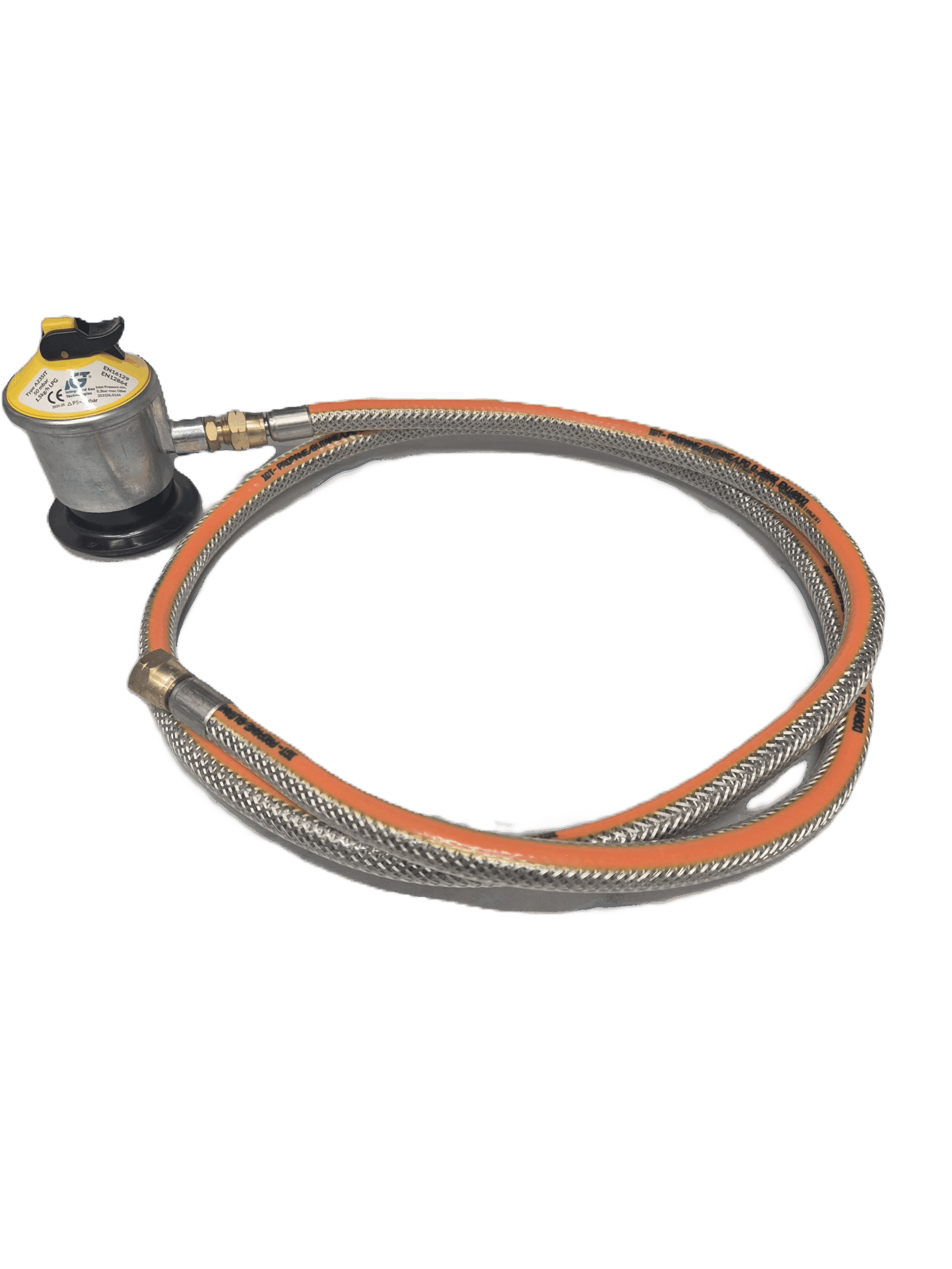 Komplett vedlikehaldsfri slange med 1,5, 4 eller 10m slange (vel i rullemeny), med 30mbar regulator
