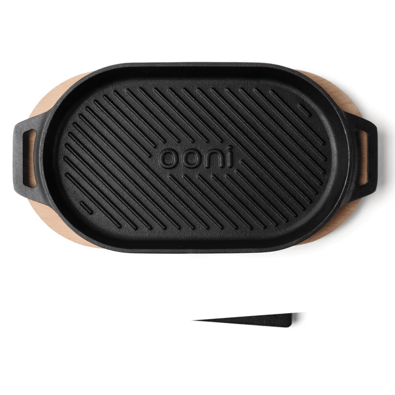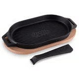 Oval støpejernspanne med grillriller. Denne har avtagbart håndtak og underlag i tre.