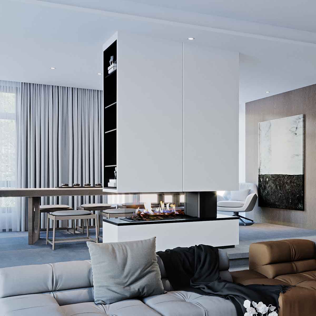 Tilgjengelig som mono (front), hjørne, 3-sidig, romdelar og tunnel. Kan enkelt brukast på rettvegg, hjørne eller som ein romdelar med gjennomsyn frå fleire rom.
