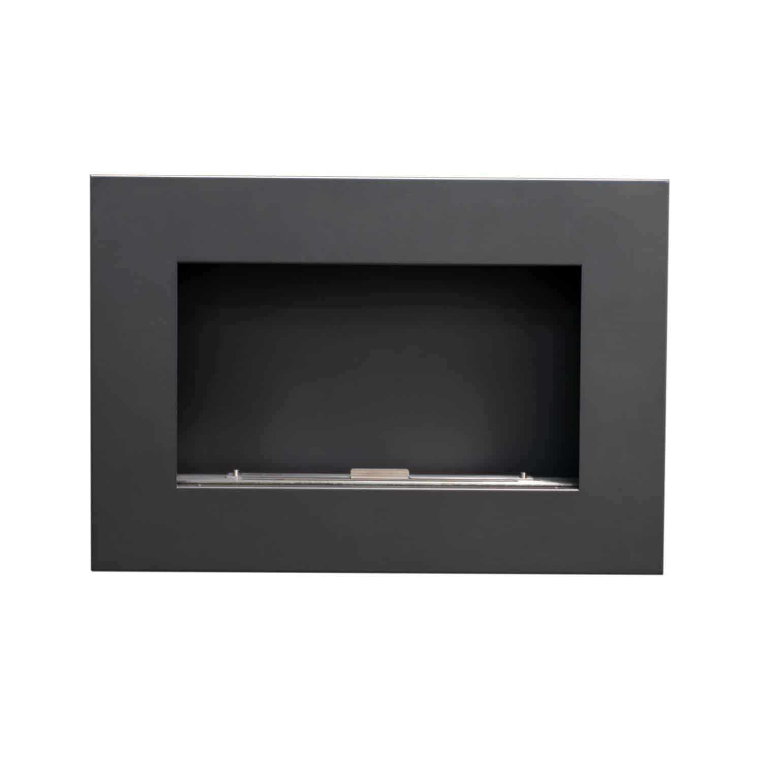 Her får du Murus 800 i en fin og stilig svart farge. Peisen er laget av 4 mm tykt pulverlakkert stål og en svart ramme. Den svarte fargen skaper en fin ramme for flammene på biopeisen, som er tydelig sett foran den svarte baksiden av peisen.