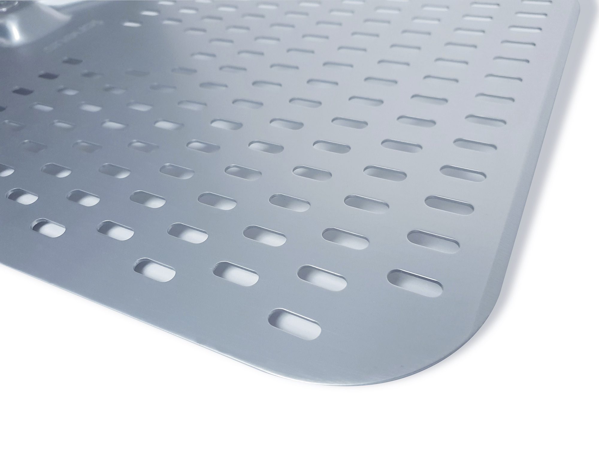 Med sitt avanserte design har spaden et 12-tommers blad i anodisert aluminium, hempe/krok til oppheng og luftehull. Hullene i pizzaspaden sørger for at overflødig mel drysser av, noe som gjør at pizzabunnen blir sprøere og reduserer sjansen for usmak på pizzaen pga svidd mel.