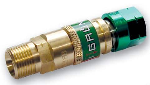 Profft rotary hurtigkobling sett fra Grün. 3/8″V innvendig han for håndtaket og 3/8″V utvendig hun til slangen.