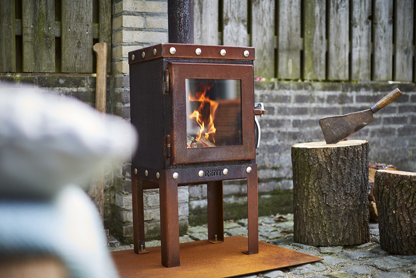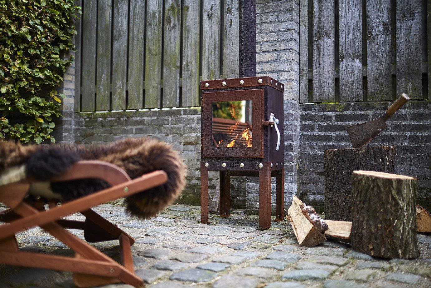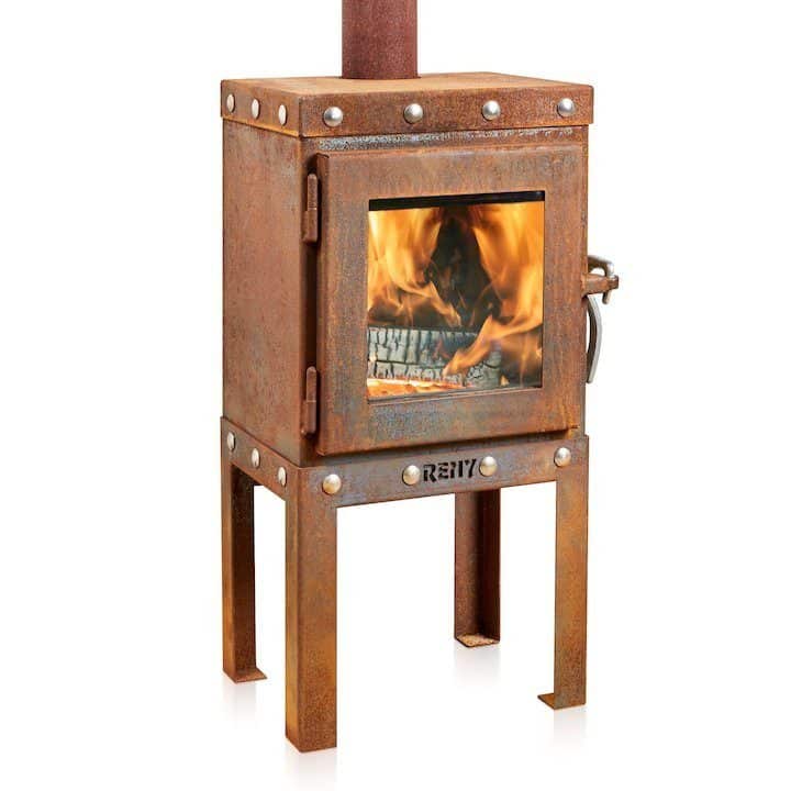 RB-1002 er en kompakt vedovn laget av 3mm CorTen stål med et industrielt utseende.